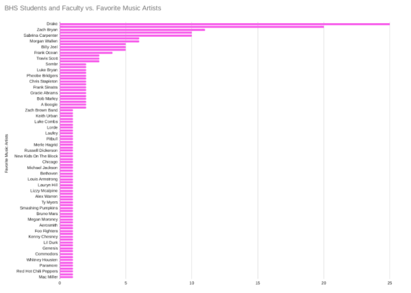 Seniors Madison Arthur and Sophia Donovan surveyed over 200 students and faculty on their favorite Music Artist or Band. While many people in Bethpage High School have different music tastes, 25 people chose the same person as their favorite.